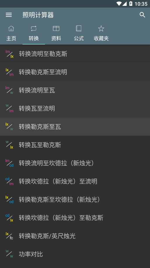 照明计算器是款专业性很强的手机计算器工具,为各位用户提供更多的功能,在线计算操作十分的便捷,各位有需要的用户可以来看看,支持各种资料以及公式的搜索,让你可以更快捷的计算,支持总光通量计算,转换流明智勒克斯、转换流明至瓦等等。