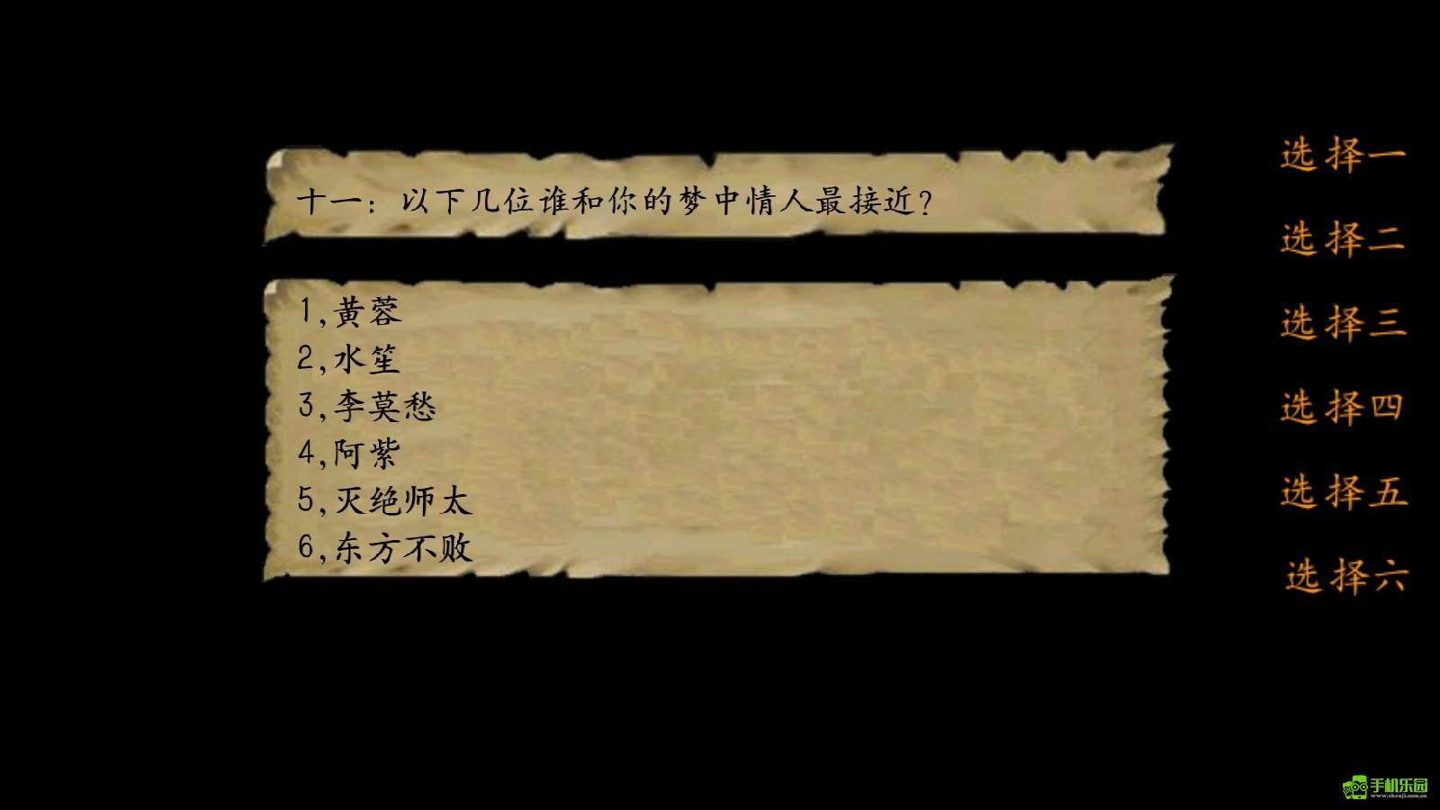 6.东方不败(好感度增加,建议选这个。选东方为梦中再灭日月神教就可以领取东方mm一枚,属性彪悍)